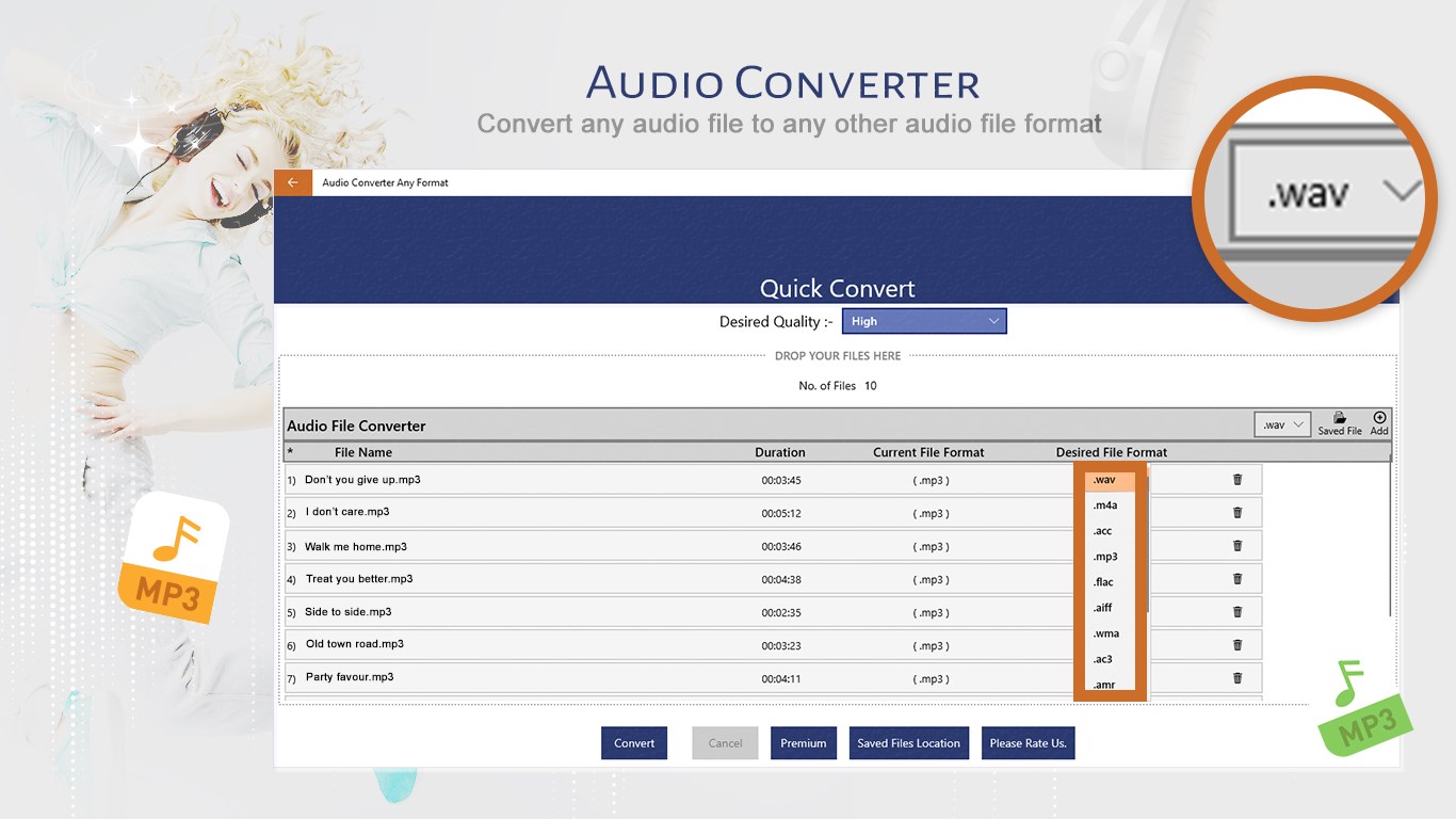Unser Konverter verarbeitet ber 300 verschiedene Dateiformate einschlielich Videoformate. How to convert WAV to MP3 online. Er wandelt sie in die Formate mp3 wav m4a flac ogg amr mp2 und m4r fr iPhone-Klingeltne um.